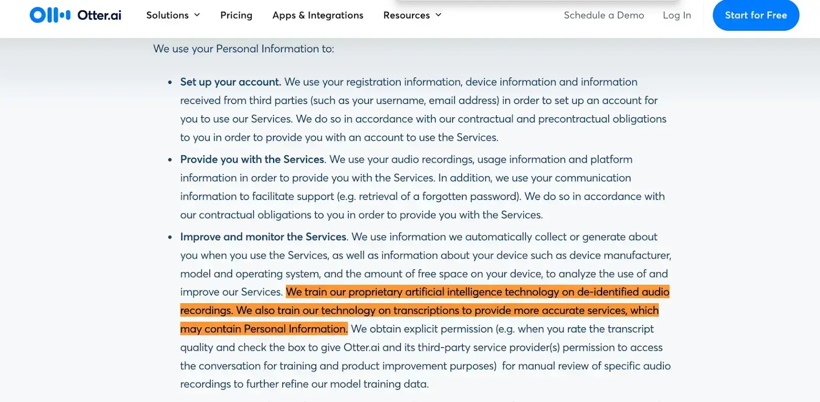"We train our proprietary artificial intelligence technology on de-identified audio recordings. We also train our technology on transcriptions to provide more accurate services, which may contain Personal Information." - Otter AI